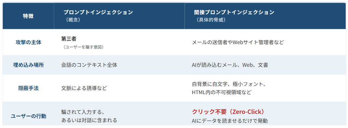 では、「プロンプトインジェクション」と「間接プロンプトインジェクション」は何がどう違うのか。比較してみると、次の図の通りです。