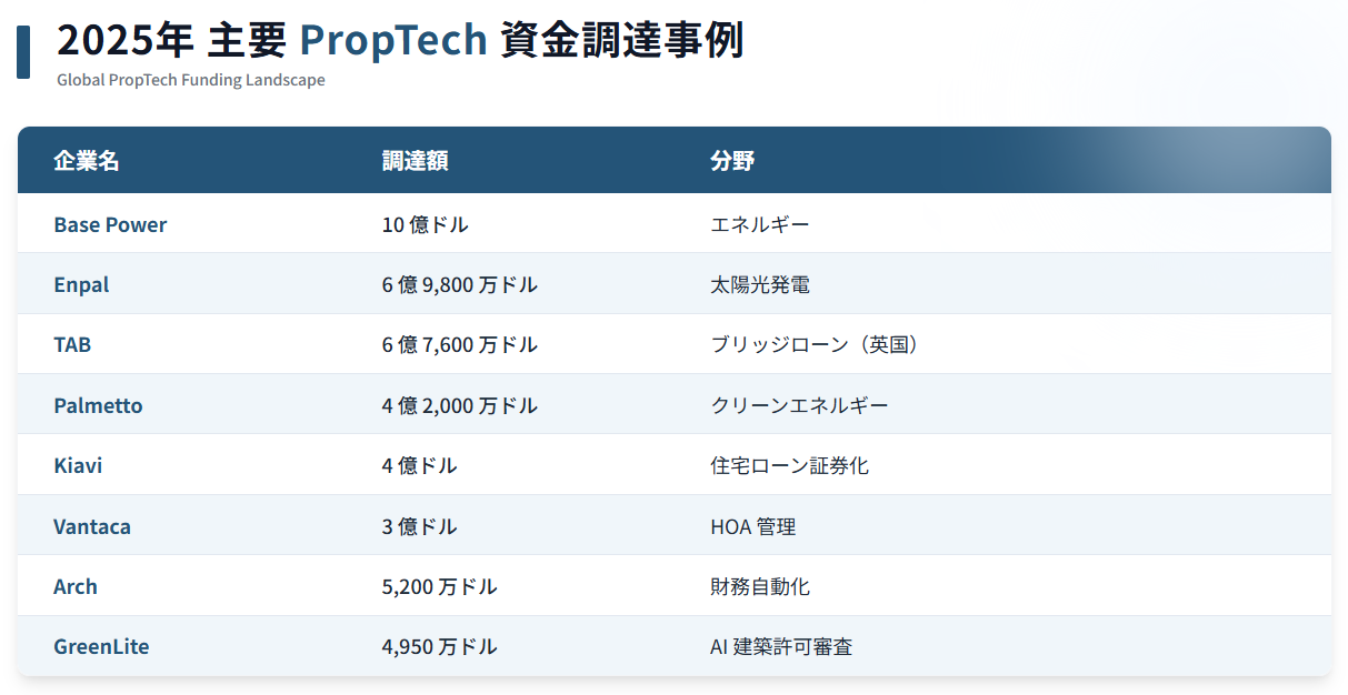 特筆すべきは、資金調達の「質」の変化です。投資家の関心は、ユーザーインターフェースの改善やマーケットプレイス型アプリから、不動産ビジネスの「インフラ」を支える技術へと移行しています。具体的には、金融インフラ、建設オートメーション、AIを活用した業務運営の3分野に資金が集中しています。