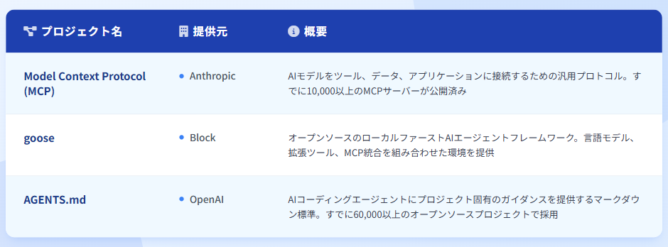 Linux Foundationは2025年12月9日、AI業界の新たなマイルストーンとなる「Agentic AI Foundation(AAIF)」の設立を発表しました。この組織には、競合関係にあるAnthropicとOpenAIが共に参画し、以下のプロジェクトが寄贈されました。